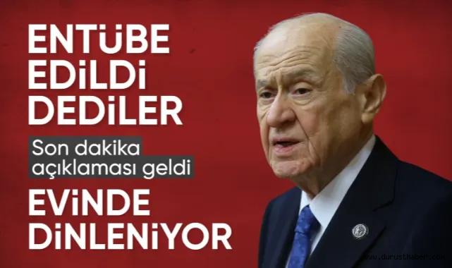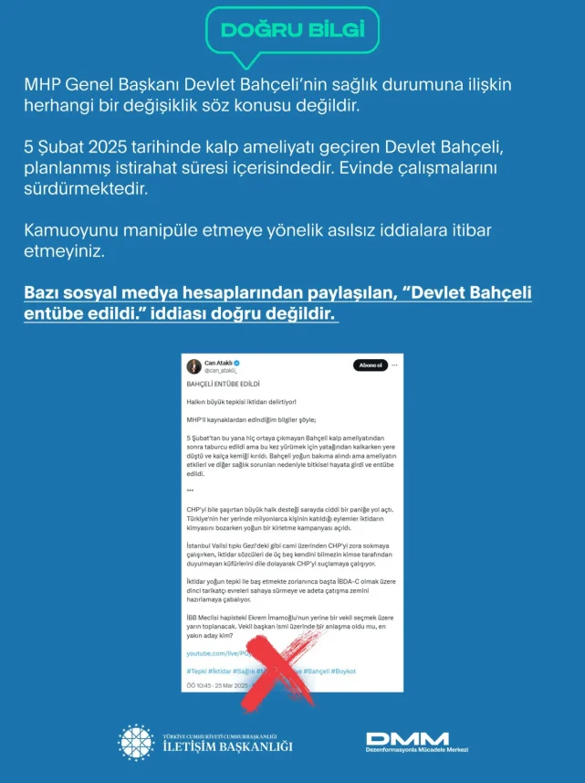 MHP'den 6 Şubat'ta yapılan resmi açıklamada, 77 yaşındaki Bahçeli'nin kalp kapakçığı ameliyatı geçirdiği ve kalp kapağının değiştirildiği duyurulmuştu.Açıklamada, Bahçeli'nin 4 Şubat’ta "planlı tetkik ve tedavileri için" hastaneye yatırıldığı, 10 yıl önce takılan kalp kapağında ortaya çıkan dejenerasyon bulguları nedeniyle 6 Şubat’ta yeni bir ameliyat yapıldığı belirtilmişti.Süreç devam ederken özellikle sosyal medya üzerinden dezenformasyona sebep olacak bilgiler sık sık dolaşıma sokuluyor.ENTÜBE EDİLDİ İDDİASIDolaşıma sokulan son iddia ise Devlet Bahçeli'nin entübe edildiğini ve bitkisel hayata girdiği yönündeydi.DMM AÇIKLAMA YAPTIİletişim Başkanlığı Dezenformasyonla Mücadele Merkezi'nin (DMM) sosyal medya hesabından, bazı sosyal medya hesaplarında yer alan "Devlet Bahçeli entübe edildi." iddialarına ilişkin açıklamada bulunuldu.Yapılan açıklamada, Bahçeli'ye yönelik entübe iddialarının gerçeği yansıtmadığı ifade edildi."ASILSIZ İDDİLARA İTİBAR ETMEYİNİZ"Söz konusu iddianın doğru olmadığı vurgulanan açıklamada, şunlar kaydedildi:MHP Genel Başkanı Devlet Bahçeli’nin sağlık durumuna ilişkin herhangi bir değişiklik söz konusu değildir. 5 Şubat 2025 tarihinde kalp ameliyatı geçiren Devlet Bahçeli, planlanmış istirahat süresi içerisindedir. Evinde çalışmalarını sürdürmektedir. Kamuoyunu manipüle etmeye yönelik asılsız iddialara itibar etmeyiniz.