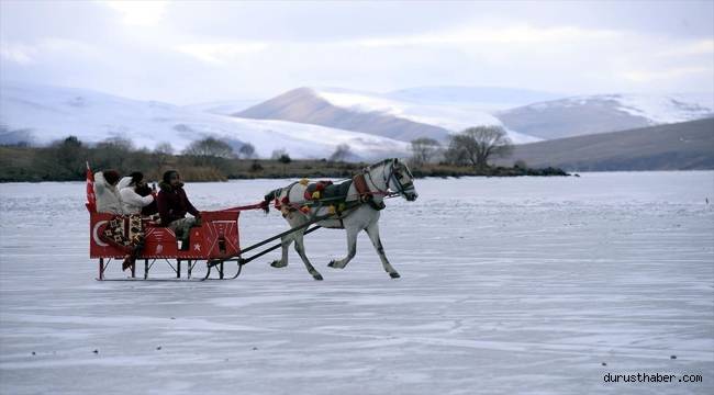 Tur firmalarıyla bölgeye gelerek gölün buzlu yüzeyine çıkan turistler, yürüyüş yapıp fotoğraf çektiriyor.Atlı kızakla gezinti heyecanı kıyılarda başladı