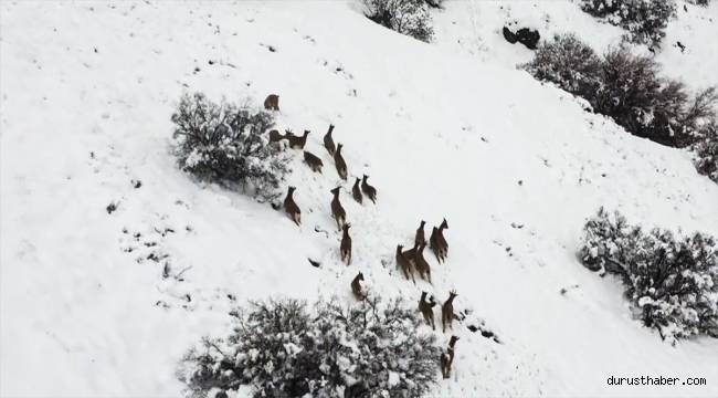 İlçe kırsalında doğa gezisine çıkan drone pilotu Mehmet Yılmaz, karla kaplı bölgede dağ keçisi sürüsü olduğunu fark etti.Yılmaz, karda sürü halinde gezen ve yiyecek arayan dağ keçilerinin görüntülerini drone ile kaydetti.