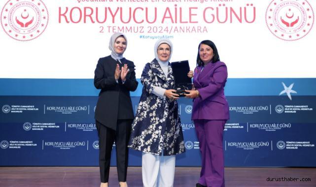 Emine Erdoğan, Kayseri Valisi Gökmen Çiçek’in eşi Sümeyra Çiçek’e, Kayseri’nin koruyucu aile sayısında en yüksek puan alması sebebiyle ödül takdim etti.