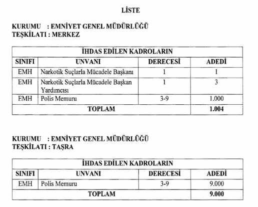 Buna göre, Emniyet Genel Müdürlüğü'nün merkez bünyesine bin taşra teşkilatına ise 9 bin memur kadrosu ilanı yapıldı.