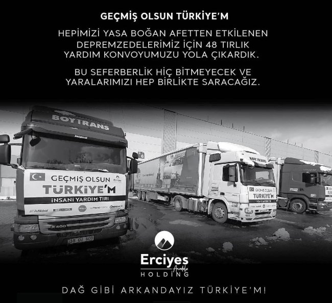 Deprem sonrası Türkiye tek yürek oldu. Birçok kurum, kuruluş, iş dünyası ve vatandaşlar tüm çabalarıyla deprem bölgesindeki depremzedeler için her türlü yardımı sağlıyor. TMSF önderliğinde Erciyes Anadolu Holding de, depremzedelerin ihtiyaçlarının karşılanması için yiyecek, giyecek, battaniye, kuru gıda, ekmek, su, çocuk bezi gibi temel ihtiyaçlardan oluşan 48 TIR yardım malzemesini deprem bölgesine gönderdi. Holding ayrıca Kahramanmaraş'ta her gün 650 kişiye 3 öğün sıcak yemek ikramı yapılacak mobil mutfak da kurdu.