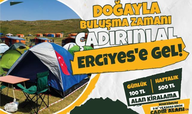 Kayseri Erciyes A.Ş. tarafından 2024 yılı yaz sezonuna özenle hazırlanan Erciyes Çadır Kamp Alanı 1 Temmuz 2024 itibariyle doğaseverlerin kullanımına açılıyor. ‘Doğayla buluşma zamanı. Çadırını al, Erciyes’e gel’ sloganıyla yeni sezonu açacak olan Erciyes Çadır Kamp Alanı, günlük 100 TL, haftalık 500 TL alan kiralama fiyat tarifesiyle doğaseverlere hizmet verecek.