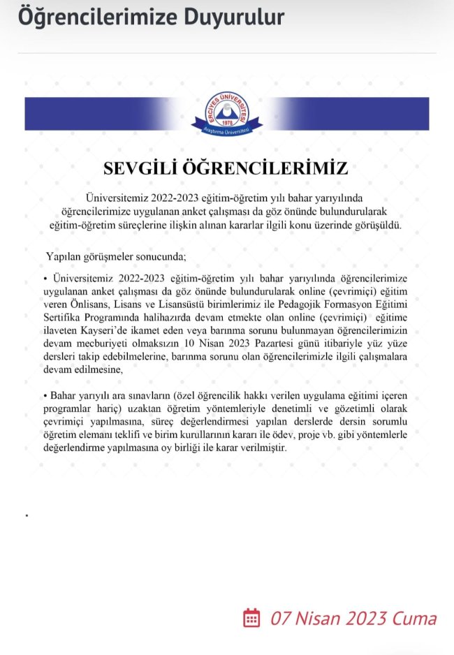 Konuyla ilgili ERÜ’den şu açıklama yapıldı: “Üniversitemiz 2022-2023 eğitim-öğretim yılı bahar yarıyılında öğrencilerimize uygulanan anket çalışması da göz önünde bulundurularak eğitim-öğretim süreçlerine ilişkin alınan kararlar ilgili konu üzerinde görüşüldü. Yapılan görüşmeler sonucunda; Üniversitemiz 2022-2023 eğitim-öğretim yılı bahar yarıyılında öğrencilerimize uygulanan anket çalışması da göz önünde bulundurularak online (çevrimiçi) eğitim veren Ön lisans, Lisans ve Lisansüstü birimlerimiz ile Pedagojik Formasyon Eğitimi Sertifika Programında halihazırda devam etmekte olan online (çevrimiçi) eğitime ilaveten Kayseri'de ikamet eden veya barınma sorunu bulunmayan öğrencilerimizin devam mecburiyeti olmaksızın 10 Nisan 2023 Pazartesi günü itibariyle yüz yüze dersleri takip edebilmelerine, barınma sorunu olan öğrencilerimizle ilgili çalışmalara devam edilmesine, Bahar yarıyılı ara sınavların (özel öğrencilik hakkı verilen uygulama eğitimi içeren programlar hariç) uzaktan öğretim yöntemleriyle denetimli ve gözetimli olarak çevrimiçi yapılmasına karar verilmiştir.”