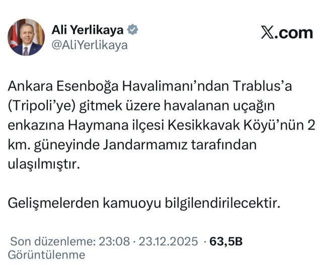 İçişleri Bakanı Ali Yerlikaya, yaptığı açıklamada uçağın enkazının Ankara’nın Haymana ilçesine bağlı Kesikkavak Köyü’nün yaklaşık 2 kilometre güneyinde Jandarma ekipleri tarafından tespit edildiğini duyurdu.