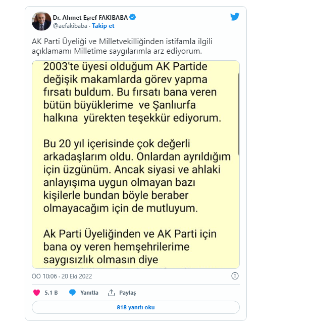 Fakıbaba'nın "Siyasi ve ahlaki anlayışıma uygun olmayan bazı kişilerle bundan böyle beraber olmayacağım için mutluyum" ifadeleri dikkat çekti.2017-2018 yıllar arasında Gıda, Tarım ve Hayvancılık Bakanı olarak görev yapan AK Parti Şanlıurfa Milletvekili Ahmet Eşref Fakıbaba, parti üyeliğinden ve milletvekilliğinden istifa ettiğini duyurdu.Sosyal medya hesabından açıklama yapan Fakıbaba, “2003'te üyesi olduğum AK Parti'de değişik makamlarda görev yapma fırsatı buldum. Bu fırsatı bana veren bütün büyüklerime ve Şanlıurfa halkına yürekten teşekkür ediyorum” dediği paylaşımına şöyle devam etti:“Bu 20 yıl içerisinde çok değerli arkadaşlarım oldu. Onlardan ayrıldığım için üzgünüm. Ancak siyasi ve ahlaki anlayışıma uygun olmayan bazı kişilerle bundan böyle beraber olmayacağım için de mutluyum. Ak Parti Üyeliğinden ve AK Parti için bana oy veren hemşehrilerime saygısızlık olmasın diye Milletvekilliğinden de istifa ediyorum. İnşallah aldığım bu karar ülkem için hayırlara vesile olur.”