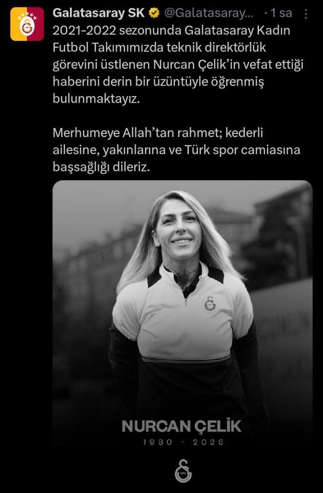 Eski Galatasaray Kadın Futbol Takımı teknik direktörü Nurcan Çelik, hayatını kaybetti. Çelik, 2021-2022 sezonunda sarı-kırmızılı ekibi çalıştırmıştı. Sarı-kırmızılı kulüp, sosyal medya üzerinden yaptığı paylaşımda üzüntüsünü dile getirerek, “2021-2022 sezonunda takımımızda teknik direktörlük görevini üstlenen Nurcan Çelik’in vefat ettiğini derin bir üzüntüyle öğrenmiş bulunmaktayız. Merhumeye Allah’tan rahmet; ailesine, yakınlarına ve Türk spor camiasına başsağlığı dileriz” ifadelerine yer verdi.