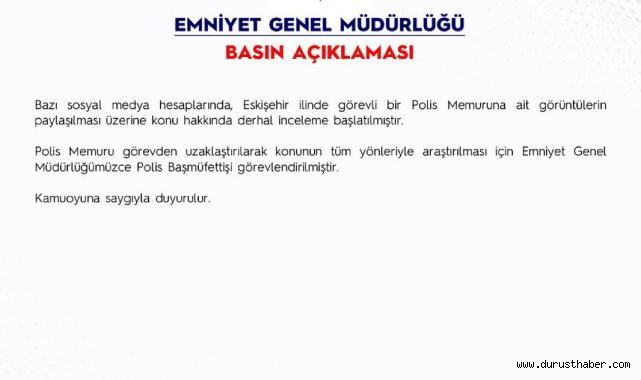 Emniyet Genel Müdürlüğü, Eskişehir ilinde görevli bir polis memuruna ait görüntülerin bazı sosyal medya hesaplarında paylaşılması üzerine Açıklama yaptı. Konuya ilişkin derhal inceleme başlatıldığı belirtilirken, polis memurunun görevden uzaklaştırıldığı duyuruldu.