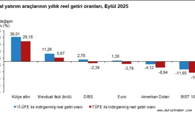 Türkiye İstatistik Kurumu (TÜİK), Eylül 2025 finansal yatırım araçlarının reel getiri oranlarını açıkladı. Buna göre aylık bazda en yüksek reel getiri yurt içi üretici fiyat endeksi ile yüzde 9,14, tüketici fiyat endeksi ile ise yüzde 8,39 oranında külçe altın yatırımcılarına sağladı.