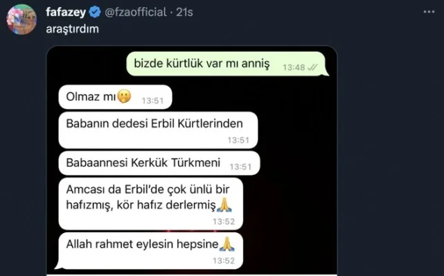 "Araştırdım"Farah Zeynep Abdullah, annesiyle konuşma anlarını ise "Araştırdım" notuyla paylaştı.