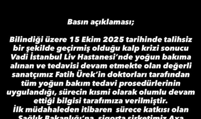 Sanatçı Fatih Ürek, 15 Ekim 2025 tarihinde geçirdiği kalp krizi sonrası Vadi İstanbul Liv Hastanesi yoğun bakım ünitesine alınmıştı. Ürek’in doktorlarından alınan bilgiye göre, tüm yoğun bakım tedavi prosedürleri eksiksiz uygulandı ve sürecin kısmi olarak olumlu şekilde devam ettiği bildirildi.