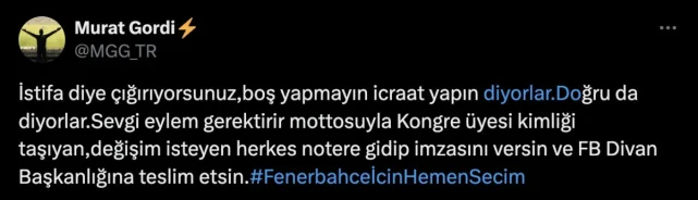 "İstifa diye çağırdığınızda, 'boş yapmayın, icraat yapın' diyorlar. Doğru da diyorlar. 'Sevgi eylem gerektirir' mottosuyla, kongre üyeliği kimliği taşıyan ve değişim isteyen herkesin notere gidip imzasını vermesini ve bunu Fenerbahçe Divan Başkanlığı'na teslim etmesini istiyorum."