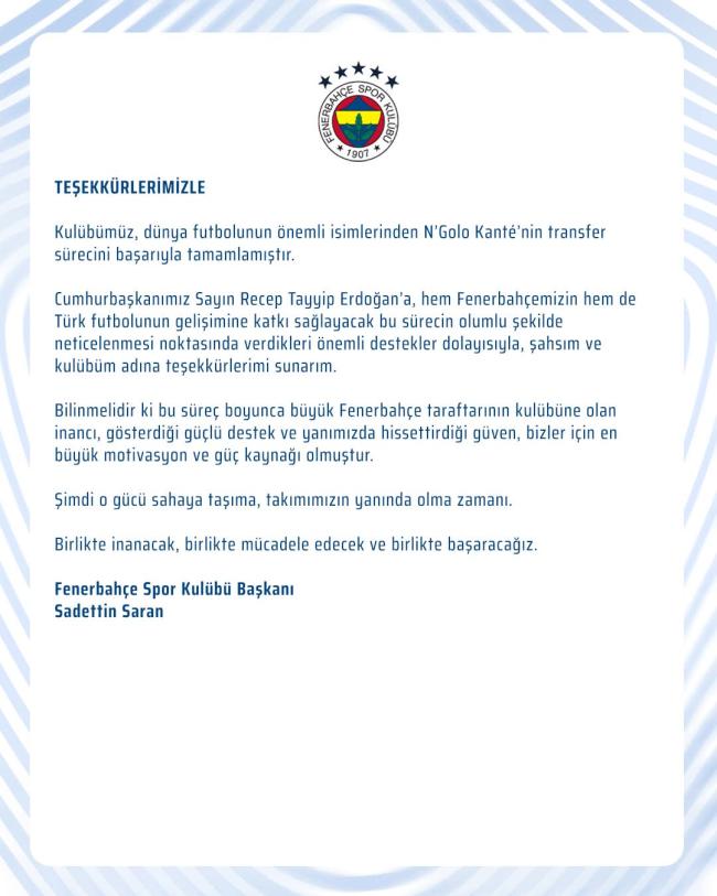 Açıklamada, Kanté transferinin kulüp hedefleri doğrultusunda atılmış önemli bir adım olduğu belirtilerek, birlik ve beraberlik mesajı verildi.