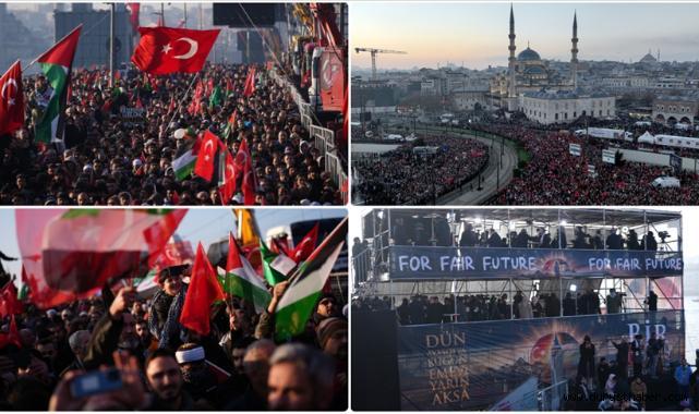 Marmaray'ın Sirkeci istasyonundan gelen çok sayıda kişi Eminönü'nden korteje katıldı. Toplu taşıma araçlarında ve duraklarda, köprüye gelenler dolayısıyla yoğunluk meydana geldi.Yürüyüşe, Gençlik ve Spor Bakanı Osman Aşkın Bak, Sanayi ve Teknoloji Bakanı Mehmet Fatih Kacır, Ticaret Bakanı Ömer Bolat, eski TBMM Başkanı Mustafa Şentop, Hür Dava Partisi (HÜDA PAR) Genel Başkanı Zekeriya Yapıcıoğlu, AK Parti Merkez Karar ve Yönetim Kurulu (MKYK) Üyesi Mahir Ünal, İlim Yayma Vakfı Mütevelli Heyeti Başkanı ve TÜGVA Yüksek İstişare Kurulu Üyesi Bilal Erdoğan, TÜGVA Genel Başkanı İbrahim Beşinci, Kadın ve Demokrasi Vakfı (KADEM) Genel Başkanı Doç. Dr. Saliha Okur Gümrükçüoğlu, Memur-Sen Genel Başkanı Ali Yalçın, HAK-İş Genel Başkanı Mahmut Arslan, birçok milletvekili ve ilçe belediye başkanları katıldı.Galata Köprüsü'nde basın için kurulan platformda "ForFairFuture (Adil Gelecek İçin)" yazılı etiketler yer alırken, dev ekranlar kuruldu, ses sistemi için de kolonlar yerleştirildi.Sanatçı Mustafa Yıldızdoğan'ın eserlerini seslendirdiği program, katılımcıların konuşmalarıyla başladı."Kimse sanmasın ki Türkiye uyuyor"İlim Yayma Vakfı Mütevelli Heyeti Başkanı ve TÜGVA Yüksek İstişare Kurulu Üyesi Bilal Erdoğan, katılımcıları selamlayarak, Hamas liderleri İsmail Heniyye ile Yahya Sinvar başta olmak üzere tüm Filistin şehitlerini ve şehitleri yad etti.