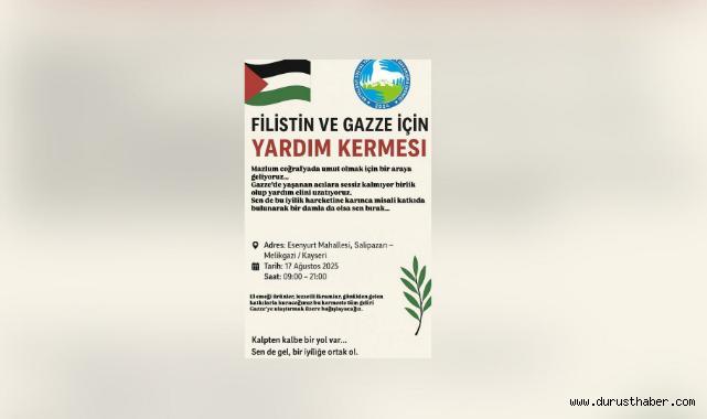 Battalgazi Sosyal Yardımlaşma ve Dayanışma Derneği, Filistin ve Gazze halkına destek olmak amacıyla anlamlı bir etkinliğe imza atıyor.Dernek Başkanı Savaş Serkuş ve dernek üyeleri, 17 Ağustos 2025 Pazar günü saat 09:00 ile 21:00 arasında yardım kermesi düzenleyecek.Düzenlenecek kermeste, gönüllüler tarafından hazırlanan yiyecek, el emeği ürünler ve çeşitli hediyelik eşyalar satışa sunulacak. Elde edilecek tüm gelir, Filistin ve Gazze’deki mazlum halkın ihtiyaçları için kullanılacak.Battalgazi Derneği yetkilileri, tüm Kayseri halkını bu dayanışma ve yardım etkinliğine davet ederek, “Kardeşlerimizin yanında olduğumuzu göstermek için birlik olma zamanı” mesajını verdi.Kermesin, hem yardım bilincini artırması hem de toplumsal duyarlılığı pekiştirmesi bekleniyor.