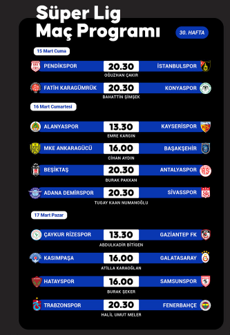 Yarın:13.30 Corendon Alanyaspor-Mondihome Kayserispor (Alanya Oba)16.00 MKE Ankaragücü-RAMS Başakşehir (Eryaman)20.30 Beşiktaş-Bitexen Antalyaspor (Tüpraş)20.30 Yukatel Adana Demirspor-EMS Yapı Sivasspor (Yeni Adana)17 Mart Pazar:13.30 Çaykur Rizespor-Gaziantep FK (Çaykur Didi)16.00 Kasımpaşa-Galatasaray (Recep Tayyip Erdoğan)16.00 Atakaş Hatayspor-Yılport Samsunspor (Mersin)20.30 Trabzonspor-Fenerbahçe (Papara Park)