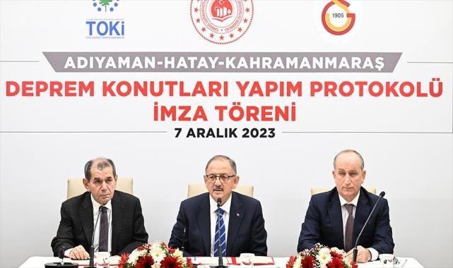Protokolün imzalanması için Çevre, Şehircilik ve İklim Değişikliği Bakanlığında düzenlenen törene Bakan Mehmet Özhaseki, Galatasaray Kulübü Başkanı Dursun Özbek ve TOKİ Başkanı Ömer Bulut katıldı. Bakan Özhaseki, 6 Şubat depremlerinin ardından 680 bini konut, 170 bini iş yeri olmak üzere 850 bin bağımsız bölümün ağır ve orta hasarlı duruma geldiğini söyledi. Devletin bu yıkımın altından kalkabilmek için büyük bir refleks gösterdiğini ve Hazine arazilerindeki sağlam zeminlerde inşaatlara başladıklarını belirten Özhaseki, şöyle konuştu:"250 bin kadar konutun yapımı devam ediyor. 8-10 ay önce başladığımız inşaatların bir kısmını teslim edecek duruma geldik. İnşallah sene başından itibaren 46 bin konutumuzu teslim edeceğiz. Her başladığımız işi bir seneye kadar teslim etmek istiyoruz. 2-3 sene içerisinde hiç deprem olmamış gibi o şehirlerimizde hayatın canlandığını, çocukların sokaklarda oynadığı günleri göreceğiz. Bütün enerjimiz bunun üzerine.""Güzel bir işe öncülük ediliyor, inşallah arkası gelir"Özhaseki, depremin yıkıcı etkisi göz önünde bulundurulduğunda devletin her yere yetişmesinin mümkün olmadığını dile getirerek, şu ifadeleri kullandı:"İşte bu noktada hayırseverlerimiz ilk günden itibaren yardımda bulunuyor. Spor kulüpleri içerisinde ilk ortaya çıkan Galatasaray. Dursun Özbek Başkan kendisi teklif etti. Bölgede birlikte temel attık. Bu konuda bir güzellik açmış oldu. Son günlerde rekabet artmıştı, bugün bir paylaşım günündeyiz. Bundan dolayı değerli Başkan'ıma, Galatasaray camiasına çok teşekkür ediyorum. Güzel bir işe öncülük ediliyor, inşallah arkası gelir diye temennide bulunuyorum. İlk etapta Adıyaman'da 100, Kahramanmaraş'ta 100 ve Hatay'da 100 konutu Galatasaray adına yapacağız. Biz de jest orak bir mahallenin adını 'Galatasaray Mahallesi' koyacağız.""Kazananın ömür boyu iftihar edeceği bir yarış olur"Galatasaray Kulübü Başkanı Özbek de güzel bir sözleşmenin imzası için bir araya geldiklerini belirterek, "6 Şubat'taki deprem ülkemizin yaklaşık yüzde 15'inin büyük hasar görmesine sebep oldu. Yüzde 15 büyük bir rakam. Devletlerin bu yükün altından kalkması kolay değil. Devletimiz elinden geleni yapıyor, refleksini çabuk gösterdi." dedi.Galatasaray Kulübü olarak destek konusunda ilk günden beri tereddüt etmediklerini vurgulayan Özbek, şöyle konuştu:"Evlerimiz Erzincan depreminde yıkıldı. Bu travmayı yaşamış birisi olarak söylüyorum, her sivil toplum kuruluşu veya her bireyin, hayırsever vatandaşların bu konuya el atması gerekiyor. Galatasaray, Türkiye'nin en büyük sivil toplum kuruluşu. Sivil toplum kuruluşu olmanın gerekleri de vardır. Madem 30 milyon taraftarımız var, 30 milyon sevenimiz var, bütçenin büyüklüğünden de bahsediliyor zaman zaman, kişi başına 20 lira toplasak bunu karşılayabiliyoruz. O zaman bunu harekete geçirmeliyiz. 20 lira her bireyin verebileceği bir rakam." Özbek, deprem bölgesinde 850 bine yakın konut ve iş yeri inşaatının yapılması ve hazırlanması gerektiğine dikkati çekerek, şöyle devam etti:"Konteynerde yaşam, aile yaşamına uygun değil, yazı var kışı var. İşin çabuklaşması süratlenmesi için de bizim gibi kuruluşların bu işe el atması lazım. Bakan'ımızdan basın toplantısını rica ettim çünkü farkındalığı ve aynı heyecanı tekrar gündeme getirelim istedim. Bizim yeşil sahalarda yarıştığımız gibi hayır işinde de yarışmamız lazım. Çağrımı rakip kulüplere yeniden yapıyorum, gelin burada da yarışalım. Bu çok güzel bir yarış olur, kazananın da ömür boyu iftihar edeceği bir yarış olur. Siz de gelin, bu işe el atın. Hep birlikte yapıldığında, anonim olduğunda son derece keyifli de olur. Galatasaray Spor Kulübü olarak elimizden gelen her şeyin en mükemmelini yapacağımızın, yapmaya devam edeceğimizin sözünü veriyorum."Özbek, şampiyonluk sözlerine "İnşallah" karşılığını verdiKonuşmaların ardından, Galatasaray Kulübü ile TOKİ arasında deprem bölgesine 300 kalıcı konut yapımıma yönelik işbirliği protokolü imzalandı.Bakan Özhaseki'nin imza sırasında, "Zenginliğin sırrı vermekmiş, belki şampiyonluğun sırrı da böyle gelir." ifadeleri üzerine Özbek, "İnşallah" karşılığını verdi.Özhaseki, Özbek ve TOKİ Başkanı Bulut, Galatasaray Kulübü'nün bağışladığı 50 milyon lira tutarındaki temsili çek ile fotoğraf çektirdi.Özbek, Bakan Özhaseki'ye 38 numaralı Galatasaray forması ile Galatasaray Lisesi'nin dış kapısının minyatürünü içeren bir plaket takdim etti. Muhabir: Özcan Yıldırım,Musa Samur