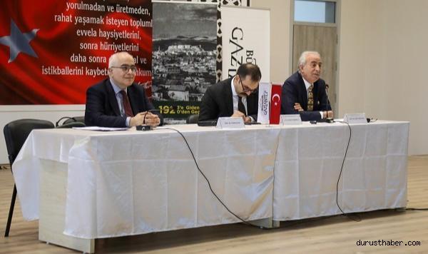 Bu kapsamda Prof. Dr. Gülan, Antep’e Gazilik unvanı ve İstiklal Madalyası verilmesinin iki kanunla gerçekleştiğini belirterek, “Bu kanunların kabulü, Gaziantep savunmasının takdirini gösteren hukuki bir süreç. Bu hukuki süreç sadece bir kanun maddesinden ibaret değil. Bu maddelerin kabulüyle ortaya çıkan sonuçlar önemli. Bu hukuki süreçle birlikte bir şehrin kendini sürekli yenilemesi, hak ettiğini alması ve benzerleri arasında farkına sahip çıkması açısından aslında biz bu fikrin devamlılığına, mücadelesine ve şehre çıkma azmine değinmiş oluyoruz” ifadelerini kullandı.