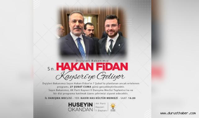 Dışişleri Bakanı Hakan Fidan, 27 Şubat Cuma günü Kayseri’ye geliyor. Daha önce 7 Şubat tarihinde planlanan ancak ertelenen programın bu hafta gerçekleştirileceği öğrenildi.