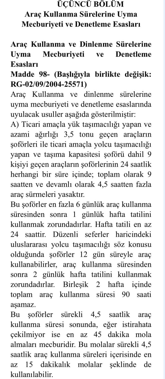 2918 Sayılı Karayolları Trafik Kanunu ve Karayolları Trafik Yönetmeliği’nin 98. maddesine göre yol şoförleri günlük 9 saat, haftada iki gün olmak şartıyla maksimum 10 saate çıkabilmektedir. Ancak bazı firmalar bu maddeleri yok sayıp şoförlerin dinlenme ihtiyaçlarını göz ardı etmektedir. Bu durum doğrudan bilinçli taksir ve ihmali gündeme getirmektedir.