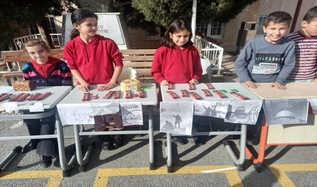 Okulun 5. sınıf öğrencileri, okul bahçesinde düzenlenen etkinlikte toplanan paraları, Filistin'deki çocuklara gönderecek.