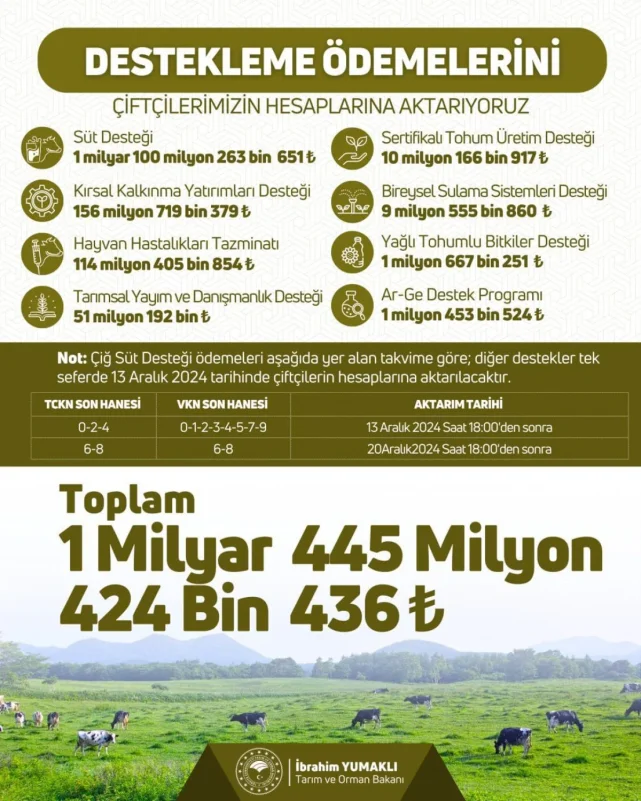 Hayırlı ve bereketli olsun."DESTEĞİN DAĞILIM"Süt Desteği: 1 milyar 100 milyon 263 bin 651 TLKırsal Kalkınma Yatırımları Desteği: 156 milyon 719 bin 379 TLHayvan Hastalıkları Tazminatı: 114 milyon 405 bin 854 TLTarımsal Yayım ve Danışmanlık Desteği: 51 milyon 192 bin TLSertifikalı Tohum Üretim Desteği: 10 milyon 166 bin 917 TLBireysel Sulama Sistemleri Desteği: 9 milyon 555 bin 860 TLYağlı Tohumlu Bitkiler Desteği: 1 milyon 667 bin 251 TLAR-GE Destek Programı: 1 milyon 453 bin 524 TL