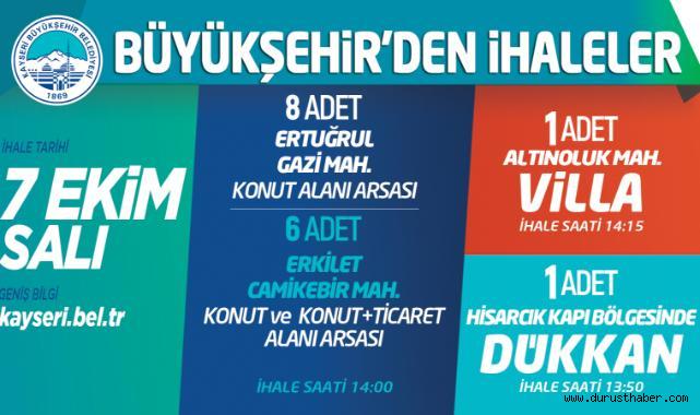Kayseri Büyükşehir Belediyesi, mülkiyetindeki taşınmazların değerlendirilmesi kapsamında yeni ihaleler düzenliyor. Bu çerçevede toplam 14 arsa, 1 villa satışa sunulurken, 1 adet dükkân ise kiraya verilecek.