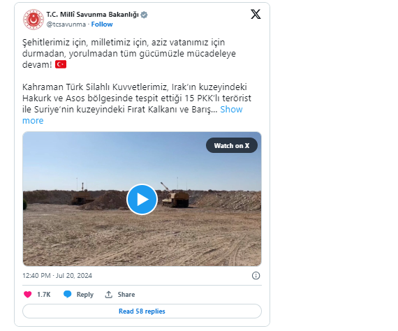 Bakanlıktan yapılan açıklamada, şunlar kaydedildi:"Şehitlerimiz için, milletimiz için, aziz vatanımız için durmadan, yorulmadan tüm gücümüzle mücadeleye devam. Kahraman Türk Silahlı Kuvvetlerimiz, Irak'ın kuzeyindeki Hakurk ve Asos bölgesinde tespit ettiği 15 PKK'lı terörist ile Suriye'nin kuzeyindeki Fırat Kalkanı ve Barış Pınarı bölgelerinde tespit ettiği 4 PKK/YPG'li teröristi etkisiz hale getirdi. Terörü kaynağında yok etmek için proaktif ve kesintisiz operasyonlarla mücadeleye devam edeceğiz."