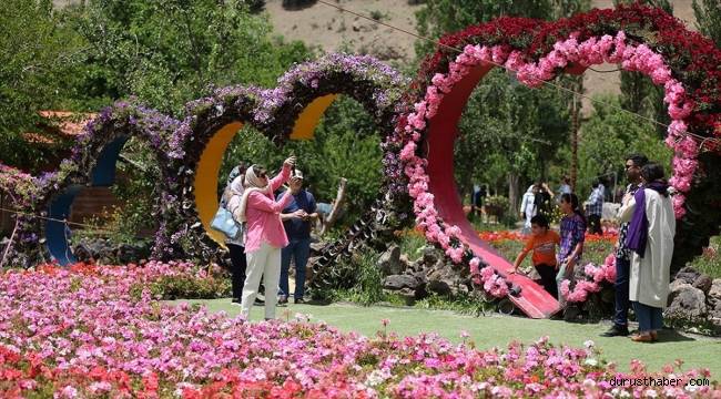 Rengarenk lalelerden yapılan çeşitli figürler, gökkuşağı ve çiçek tüneli ziyaretçilerden yoğun ilgi görürken, laleler arasında gezenler bol bol hatıra fotoğrafı çektiriyor.