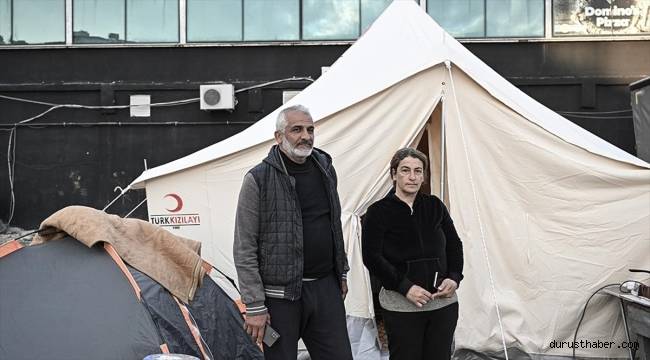 Artçı sarsıntıların devam ettiği ilçede, Meydan Mahallesi'nde bir binada yaşayan Çiçek çifti ile iki çocuğu, yıkıcı depremlerin meydana geldiği 6 Şubat'tan sonra evlerine giremedi.