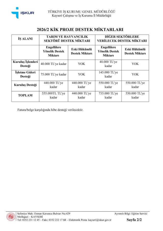 Program kapsamında engelli vatandaşların kendi işini kurma projelerine 735 bin liraya kadar hibe desteği verilecek. Eski hükümlü vatandaşların kendi işini kurma projeleri için ise 550 bin liraya kadar destek sağlanacak. Ayrıca korumalı işyeri projelerine 905 bin liraya kadar kuruluş sermayesi desteği sunulacağı bildirildi.