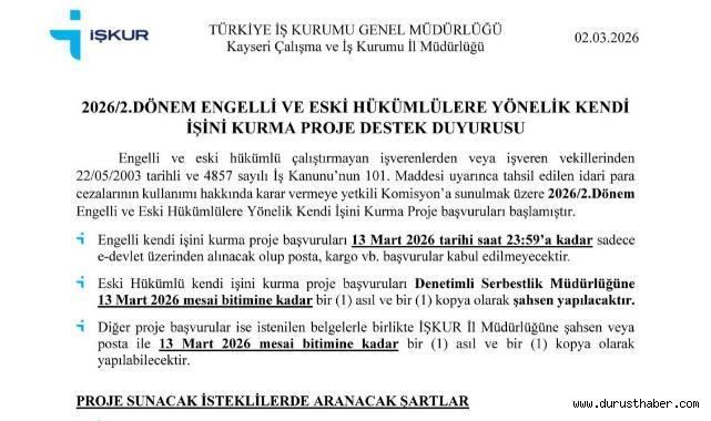 İŞKUR Kayseri, engelli ve eski hükümlü vatandaşların istihdama katılımını artırmak amacıyla sağlanan hibe desteklerinin 2026 yılı 2. dönem başvurularının başladığını duyurdu. Başvuruların son tarihi 13 Mart olarak açıklandı.