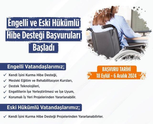 İŞKUR tarafından, eski hükümlü ve engelli vatandaşlara yönelik Hibe Desteği projesine başvurular başladı. Projeye katılmak isteyen vatandaşlar E-devlet veya İŞKUR şubeleri üzerinden 18 Eylül-Aralık 2024 arası başvuru yapabilecek