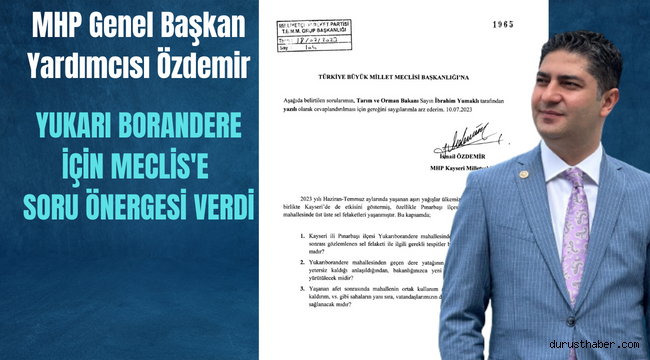 Milliyetçi Hareket Partisi Genel Başkan Yardımcısı ve Kayseri Milletvekili İsmail Özdemir, Pınarbaşı ilçesi Yukarıborandere mahallesinde her yağış sonrası üst üste oluşan sel felaketi nedeniyle sorunun çözüme kavuşturulması için Tarım ve Orman Bakanlığı’na yazılı soru önergesi verdi.