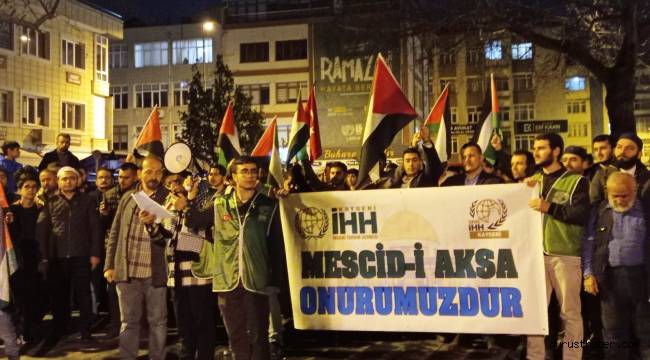 Eylemde okunan bildiride; “İlk kıblemiz, miracımız, göz bebeğimiz, kalbimiz, vicdanımız, onurumuz ve kırmızı çizgimiz olan Kudüs, bu Ramazan ayında da yine İsrail’in saldırılarına maruz kalmıştır. İsrail’in kronikleşmiş saldırıları sonucu Mescidi Aksa’yı bir Yahudi mabedine çevirmek isteniliyor. Mescid-i Aksa’ya düzenlenen toplu baskınlar, orada ibadet eden Müslümanlara yapılan saldırılar, ilahi hatıranın vücut bulduğu yapıya verilen zararlar, Müslümanların buraya girişlerine konulan engeller, Mescid-i Aksa’nın altının oyulmasıyla oluşturulan tüneller, buradaki ibadetgâhlara uygulanan kapatmalar, Yahudilerin burada gerçekleştirdiği ayinler ve pervasızlıklar, her türlü sosyal ve kamusal baskılamalar, İsrail’in Mescid-i Aksa üzerindeki düşlerinin yapı taşları olarak karşımıza çıkmaktadır. İsrail’in bu zorbalığına rağmen Müslümanların onurlu ve izzetli direnişi; İsrail’i her geçen gün düşlerinden uyandırarak gerçeğe doğru yaklaştırıyor, düşler yerini kabuslara bırakıyor. Bu hakikat, İsrail’in gün geçtikçe daha da çirkefleşmesine, saldırganlaşmasına ve zorbalaşmasına yol açıyor. Ramazan ayı daha ilk günlerinde bugüne yaşanan olaylarda İsrail yine her zaman ki zalim tutumuyla Mescid-i Aksa üzerine saldırıya geçmiştir. Bugün dünya üzerindeki bütün vicdan sahibi insanlar olarak yine tek ses olmalı, İsrail’e karşı tek yürek tavrımızı ve haklılığımızı ortaya koymalıyız’ ifadelerine yer verildi.