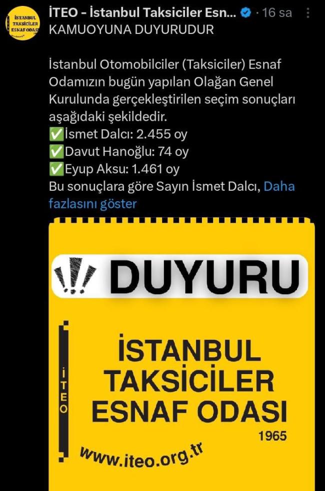 Seçimde İsmet Dalcı, Davut Hanoğlu ve Eyüp Aksu yarıştı. Oy sayımına göre, Dalcı 2 bin 455 oyla birinci olurken, Aksu 1.461 oy aldı. Davut Hanoğlu ise 74 oyda kaldı. Bu sonuçla İsmet Dalcı İstanbul Taksiciler Esnaf Odası’nın yeni başkanı oldu.