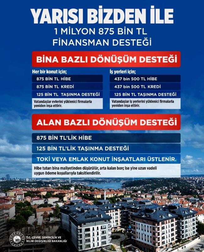 Konutlar için: 875 bin TL hibe, 875 bin TL kredi ve 125 bin TL taşınma desteği (Toplam destek tutarı: 1 milyon 875 bin TL).