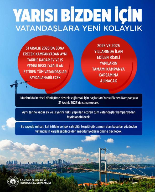 İstanbul’da kentsel dönüşümü hızlandırmak amacıyla başlatılan Yarısı bizden kampanyası için yeni bir düzenleme yürürlüğe girdi. Resmi Gazete’de yayımlanan Cumhurbaşkanlığı Genelgesi ile 31 Aralık 2026’ya kadar riskli yapı ilan edilen tüm konut ve iş yerlerinin kampanyadan yararlanmasının önü açıldı. Bu düzenlemeyle, sürecin teknik aşamalarında (ruhsat ve hak sahipliği gibi) yaşanan zaman kayıplarının vatandaşlar için hak kaybına ve mağduriyete yol açmasının önüne geçilmesi amaçlanıyor.