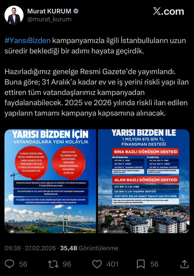Bakan Kurum’dan Açıklama Çevre, Şehircilik ve İklim Değişikliği Bakanı Murat Kurum, sosyal medya hesabından yaptığı paylaşımda, İstanbulluların uzun süredir beklediği adımın atıldığını belirtti. Kurum, yıl sonuna kadar riskli yapı ilan edilen tüm ev ve iş yerlerinin kampanya kapsamında destek alabileceğini duyurdu.
