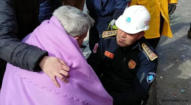 Kahramanmaraş merkezli 10 ili etkileyen 7,7 ve 7,6 büyüklüklerindeki depremler nedeniyle Kahramanmaraş'a giden Merzifon Belediyesi itfaiye ekipleri, Trabzon Caddesi'nde bir apartmanın enkazından yaşlı bir adamı sağ çıkardı.