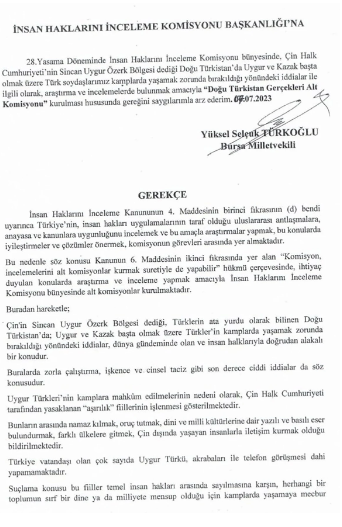 İYİ Parti Bursa Milletvekili Selçuk Türkoğlu, Çin'in Doğu Türkistan’da yaşayan Türklere yönelik insanlık dışı uygulamalar yaptığı yolundaki iddialarının araştırılması için TBMM İnsan Haklarını İnceleme Komisyonu bünyesinde “Doğu Türkistan Gerçekleri Alt Komisyonu” kurulmasını teklif eden bir önerge sundu.İYİ Parti Bursa Milletvekili Selçuk Türkoğlu’nun Çin’in işgalindeki Doğu Türkistan’da yaşayan Türklere yönelik insanlık dışı uygulamalar yaptığı yolundaki iddialarının araştırılması için TBMM İnsan Haklarını İnceleme Komisyonu bünyesinde “Doğu Türkistan Gerçekleri Alt Komisyonu” kurulmasını teklif eden bir önerge sunduğu açıklandı.Türkoğlu, kurulması teklif edilen alt komisyonun amacının bölgede yaşayan Uygurlar ve diğer Türklerin Çin yönetimi tarafından insanlık dışı uygulamalara mahkum edildikleri yolundaki iddialarını araştırmak, bu iddiaların doğru olup olmadığını teyit edilmiş gerçek bilgilerle Türk ve dünya kamuoyu ile paylaşmak olacağını da bildirdi.Türkoğlu'nun verdiği teklif şöyle :