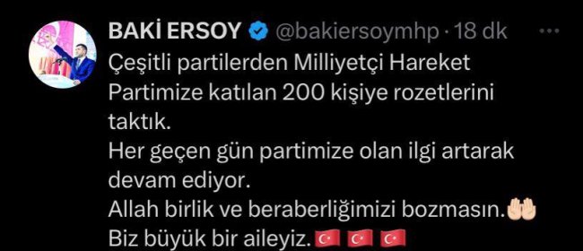 MHP milletvekili baki ersoy konuyla ilgili sosyal medya hesabından “Çeşitli partilerden Milliyetçi Hareket Partimize katılan 200 kişiye rozetlerini taktık.Her geçen gün partimize olan ilgi artarak devam ediyor.Allah birlik ve beraberliğimizi bozmasın. Biz büyük bir aileyiz” paylaşımında bulundu.