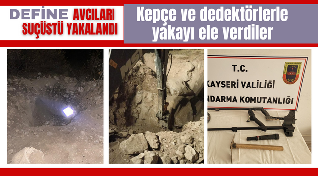 Kayseri ili Özvatan İlçesi Merkez Jandarma Karakol Komutanlığı ekipleri 3 kişinin dedektör ile arama yaptığı ihbarı üzerine harekete geçti. Bahse konu bölgeye gidilerek yapılan kontrollerde K.D, T.D. ve N.Ö. isimli kişilerin dedektör ile arama yaptığı tespit edildi. 3 kişi suçüstü yakalanarak gözaltına alındı. Şüphelilerin yanlarında bulunan 2 adet el dedektörü, 1 adet pointer arama dedektörü ve 1 adet çapa aleti muhafaza altına alındı.