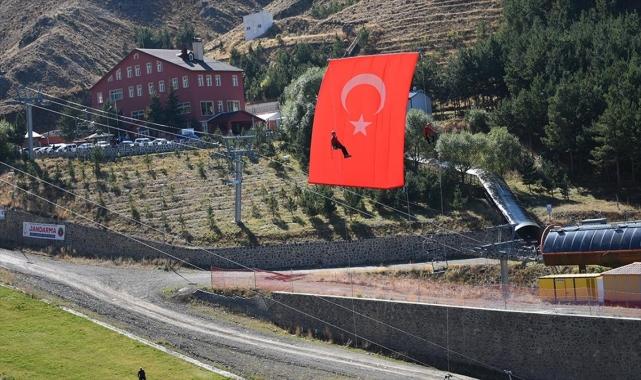 Erzurum İl Jandarma Komutanlığında görev yapan Jandarma Arama Kurtarma (JAK) ve Sualtı Arama Kurtarma (SAK) ekipleri, Cumhuriyet'in 100. yıl dönümü kapsamında Türk bayrağıyla yaptıkları gösterilerle "Her yerde göreve hazırız" mesajı verdi.