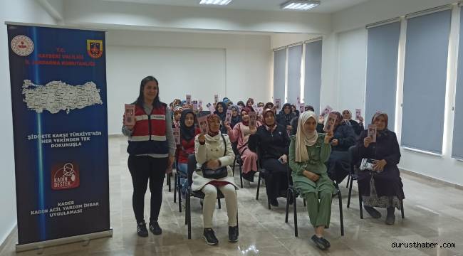 Kayseri İl Jandarma Komutanlığı Aile İçi Şiddetle Mücadele ve Çocuk Kısım Amirliği personeli tarafından İncesu ilçesinde bulunan Aile Destek Eğitim Merkezinde (ADEM) kurs gören 45 kadına Kadın Destek Uygulaması (KADES) programı hakkında bilgilendirme yapıldı.