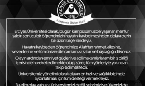 “Erciyes Üniversitesi olarak, bugün kampüsümüzde yaşanan menfur saldırı sonucu bir öğrencimizin hayatını kaybetmesinden dolayı derin bir üzüntü içerisindeyiz. Hayatını kaybeden öğrencimize Allah’tan rahmet, ailesine, sevenlerine ve tüm üniversite camiamıza sabır ve başsağlığı diliyoruz. Olayın ardından emniyet güçleri ve adli makamlarla tam bir iş birliği içerisinde hareket edilmekte olup, süreç tüm yönleriyle yakından takip edilmektedir.”