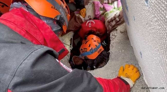 Kahramanmaraş şehir merkezinde Hayrullah Mahallesi Kuddusi Baba Bulvarı üzerinde yıkılan Üçgözler Apartmanı'nda çalışmalarını yürüten ekipler, öğlen saatlerinde yıkıntılar arasından seslerin geldiğini belirledi.
