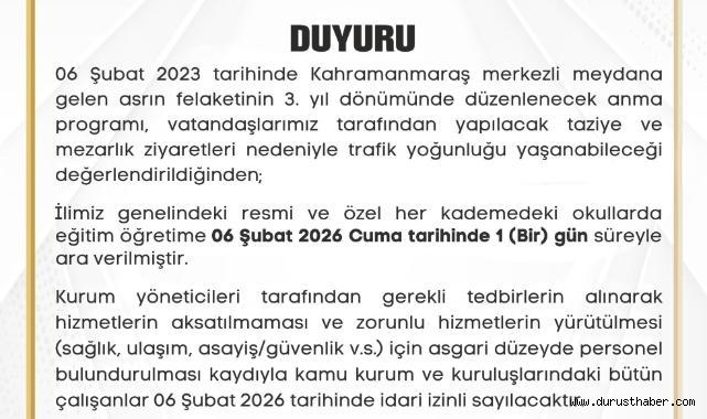 Valilikten yapılan açıklamada, anma programları ile vatandaşların yapacağı taziye ve mezarlık ziyaretleri nedeniyle trafik yoğunluğu yaşanabileceği değerlendirildiği belirtildi. Bu kapsamda il genelindeki resmi ve özel tüm okullarda 6 Şubat 2026 Cuma günü eğitim-öğretime 1 gün süreyle ara verildi.
