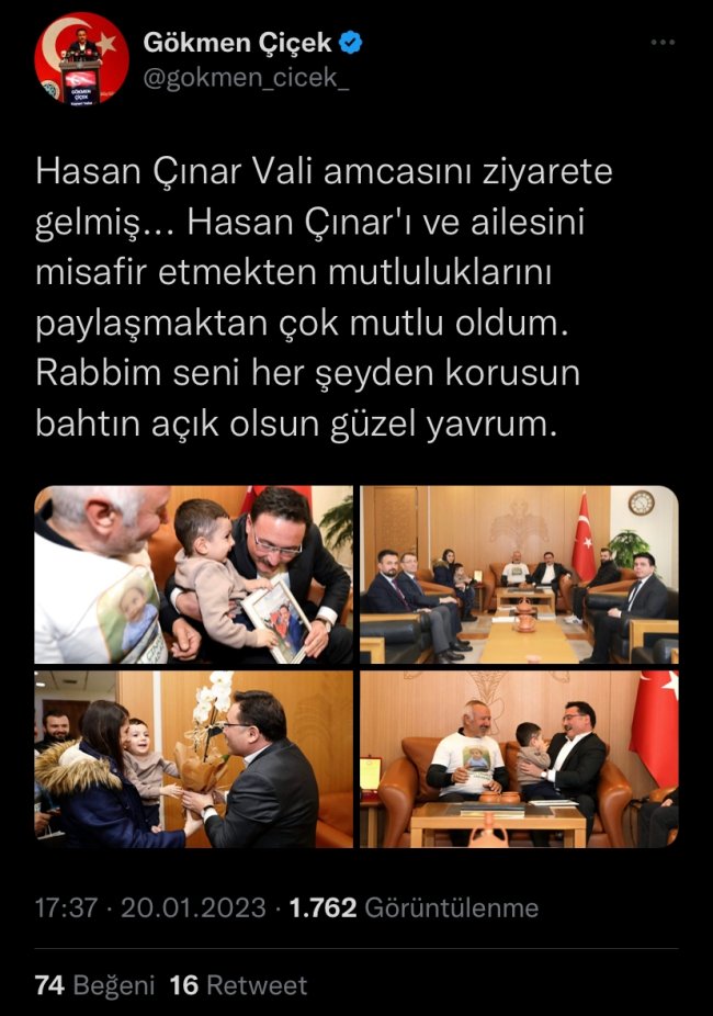 Ziyaret anlarından görüntüler paylaşan ve mutluluğunu dile getiren Vali Çiçek sosyal medya hesabından şu açıklamayı yaptı: “Hasan Çınar Vali amcasını ziyarete gelmiş.. Hasan Çınar’ı ve ailesini misafir etmekten mutluluklarını paylaşmaktan çok mutlu oldum. Rabbim seni her şeyden korusun bahtın açık olsun güzel yavrum.”