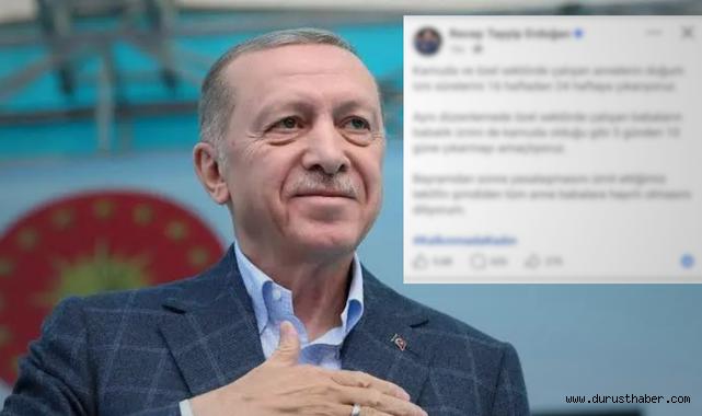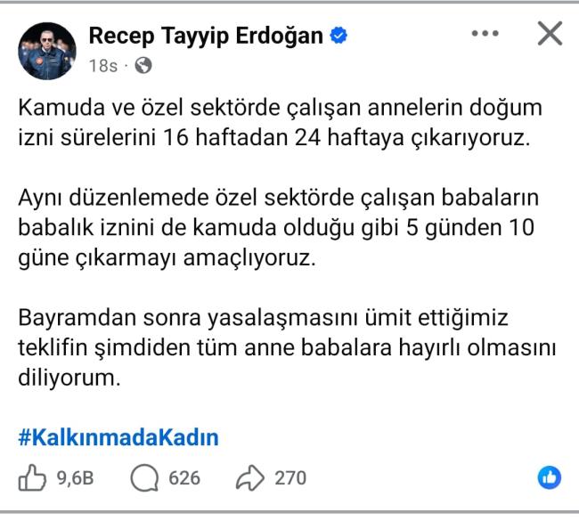 Cumhurbaşkanı Recep Tayyip Erdoğan, kamuda ve özel sektörde çalışan annelerin doğum izni süresinin 16 haftadan 24 haftaya çıkarılacağını açıkladı. Aynı düzenlemeyle, özel sektörde çalışan babaların babalık izninin de kamuda olduğu gibi 5 günden 10 güne çıkarılması hedefleniyor. Erdoğan, yaptığı sosyal medya paylaşımında, "Bayramdan sonra yasalaşmasını ümit ettiğimiz teklifin şimdiden tüm anne babalara hayırlı olmasını diliyorum" ifadelerini kullandı.